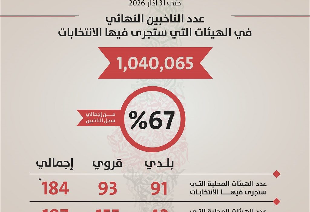 بيت لحم 2000 – قالت لجنة الانتخابات المركزية، اليوم الثلاثاء، إن عدد الناخبين النهائي في الهيئات التي ستُجرى فيها الانتخابات المحلية يوم 25 نيسان/إبريل بلغ مليونا و40 ألف ناخب وناخبة، وهو ما يشكّل نسبة 67% من إجمالي سجل الناخبين.