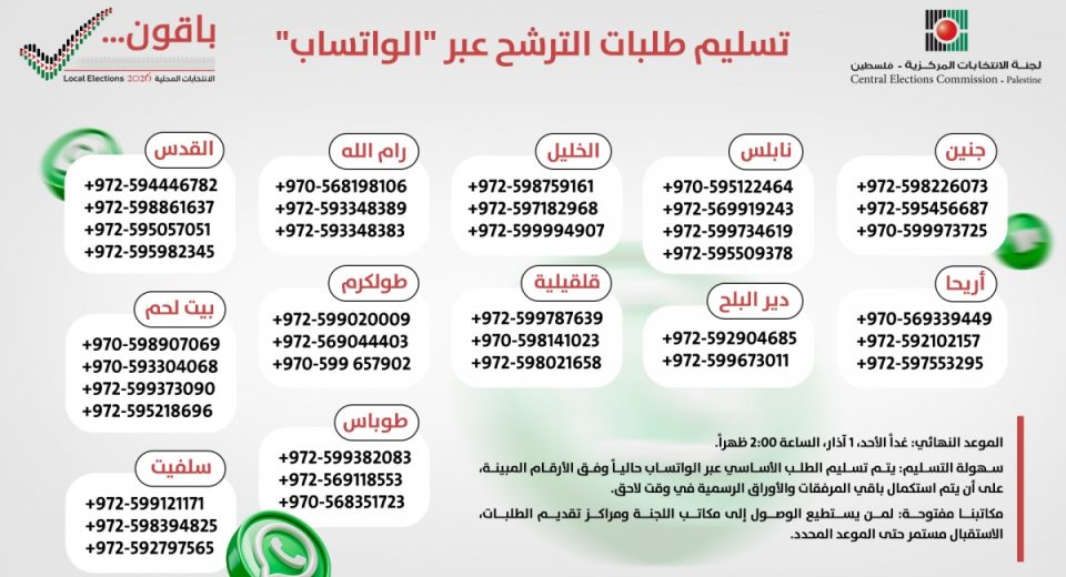 بيت لحم 2000 – أعلنت لجنة الانتخابات المركزية أنه بسبب ظروف الحرب الراهنة وما تشهده المحافظات الفلسطينية من إغلاقات للحواجز والبوابات وتأثر الحركة وصعوبة الوصول إلى مكاتب اللجنة، فقد تقرر اعتماد إجراءات استثنائية تضمن استمرار عملية الترشح لانتخابات المجالس المحلية 2026 في موعدها المحدد. ودعت اللجنة المواطنين الراغبين بتقديم طلبات الترشح، سواء كأفراد لعضوية المجالس القروية أو كقوائم […]