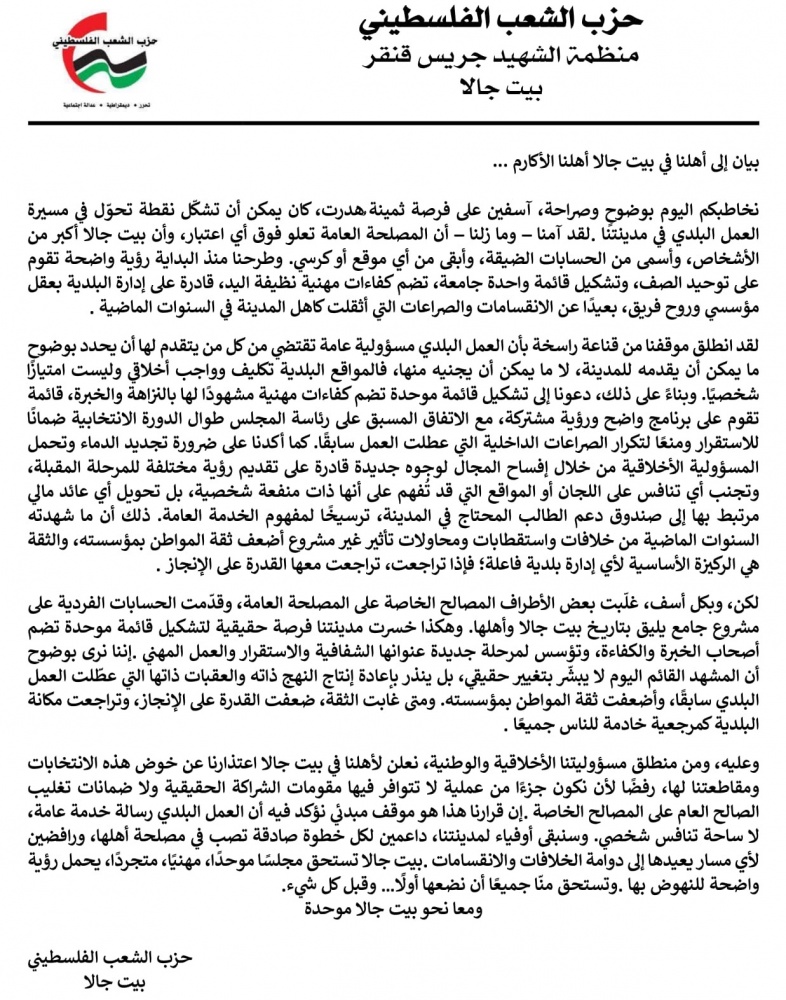محلي حزب الشعب في بيت جالا يعلن مقاطعة انتخابات البلدية بيت لحم 2000 – أعلن حزب الشعب في بيت جالا انسحابه من المشاركة في انتخابات البلدية القادمة، المزمع إطلاقها 25... 4 مارس, 2026 3:49 م