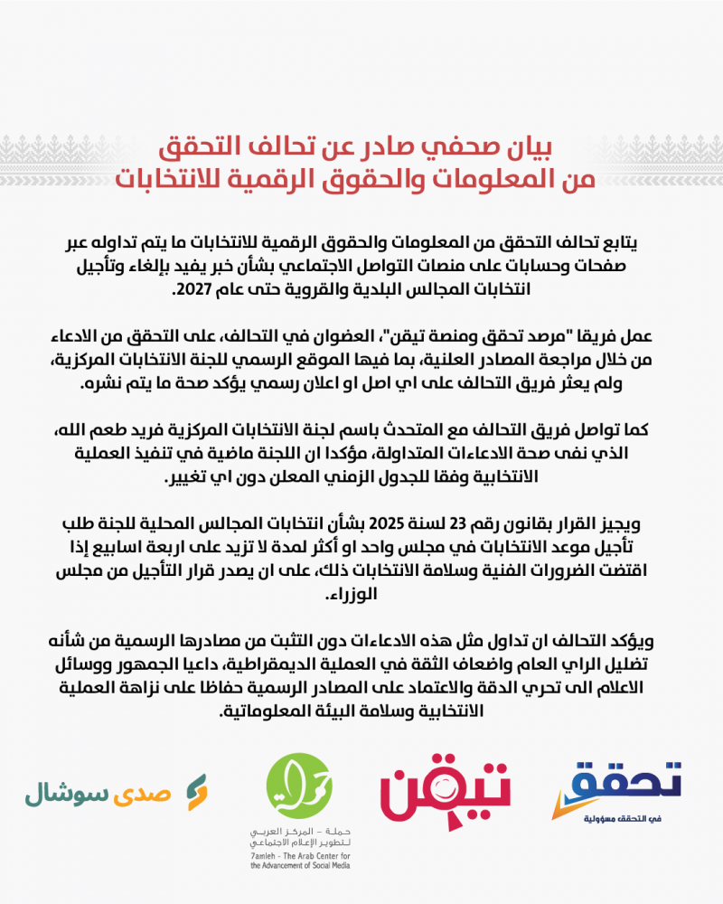 محلي تحالف التحقق ينفي إلغاء أو تأجيل انتخابات المجالس المحلية حتى 2027 ويؤكد الالتزام بالجدول... بيت لحم 2000 – نفى تحالف التحقق من المعلومات والحقوق الرقمية للانتخابات صحة ما يتم تداوله عبر صفحات وحسابات على... 4 مارس, 2026 1:06 م