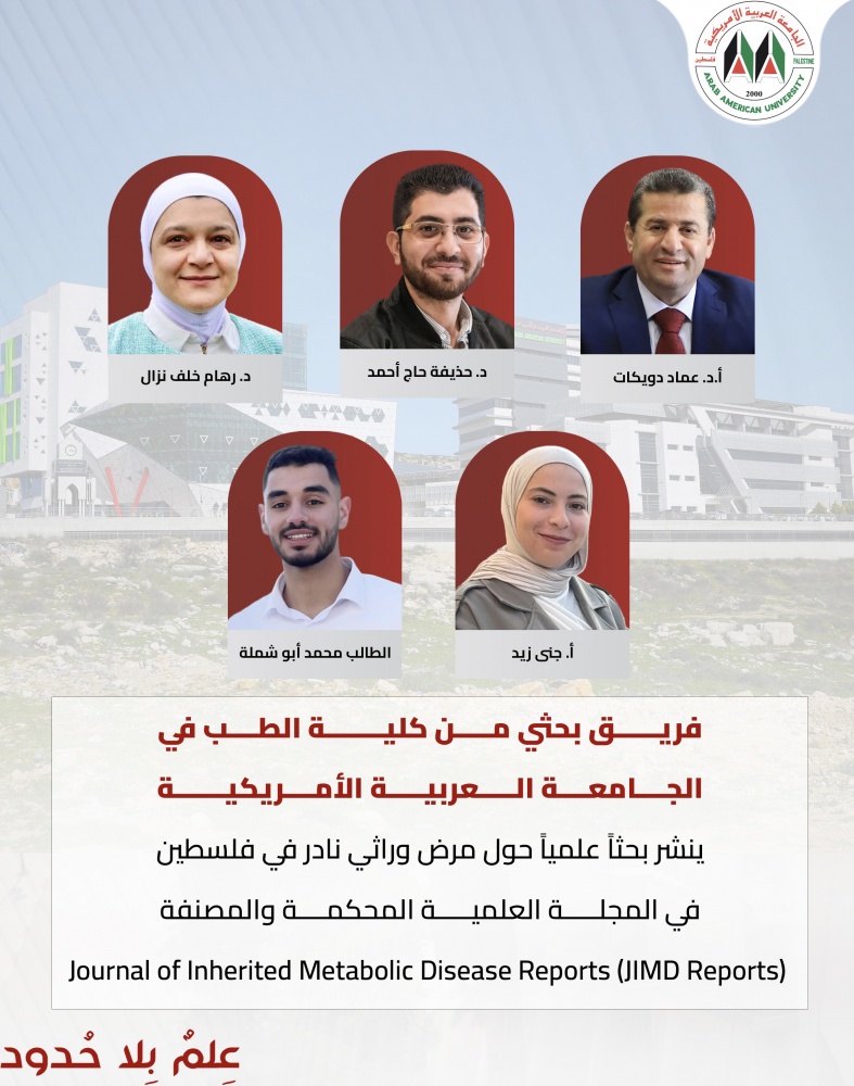 محلي فريق بحثي من الجامعة العربية الأمريكية ينشر بحثا علميا في المجلة العلمية المحكمة والمصنفة... بيت لحم 2000 – نشر فريق بحثي من كلية الطب في الجامعة العربية الأمريكية دراسة علمية متقدمة تناولت مرض داء... 3 مارس, 2026 2:38 م